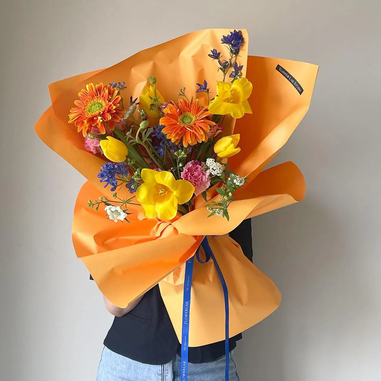 Colorful orange tone color bouquet – B06 สำหรับเป็นช่อดอกไม้แสดงความยินดี และโอกาสอื่นๆ จากร้านดอกไม้ Flowerlab Studio ร้านดอกไม้บนถนนเจริญนคร สไตล์มินิมอล เกาหลี