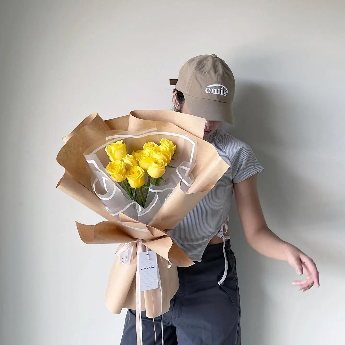 ช่อดอกกุหลาบสีเหลือง ห่อด้วยกระดาษสีน้ำตาล สำหรับเป็นช่อดอกไม้แสดงความยินดี และโอกาสอื่นๆ จากร้านดอกไม้ Flowerlab Studio ร้านดอกไม้บนถนนเจริญนคร สไตล์มินิมอล เกาหลี